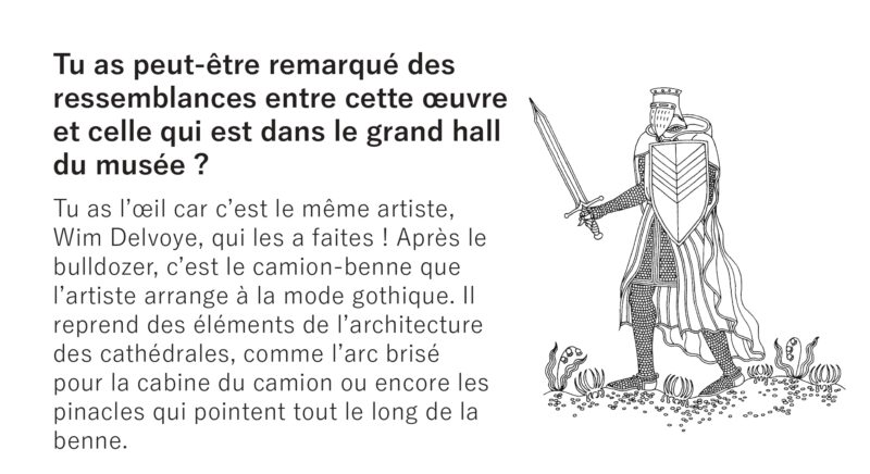Les fiches œuvres sont disponibles en téléchargement afin de vous donner la possibilité de créer votre propre parcours en choisissant parmi les 250 œuvres présentées. Vous y trouverez les cartels développés, rédigés par les équipes de la conservation, ainsi que les cartels illustrés. Ils ont tous été travaillés par des publics du territoire, des habitants voisins du musée, des étudiants volontaires, des partenaires de la santé, de la solidarité ou des arts vivants, avec les équipes de médiation du Louvre-Lens. Plus de 200 contributrices et contributeurs partagent ainsi leur ressenti et leur interprétation des œuvres exposées. Ils nous invitent à les observer attentivement, à les écouter, à les imaginer, à les imiter, à les dessiner, à les écrire ou même à les danser.